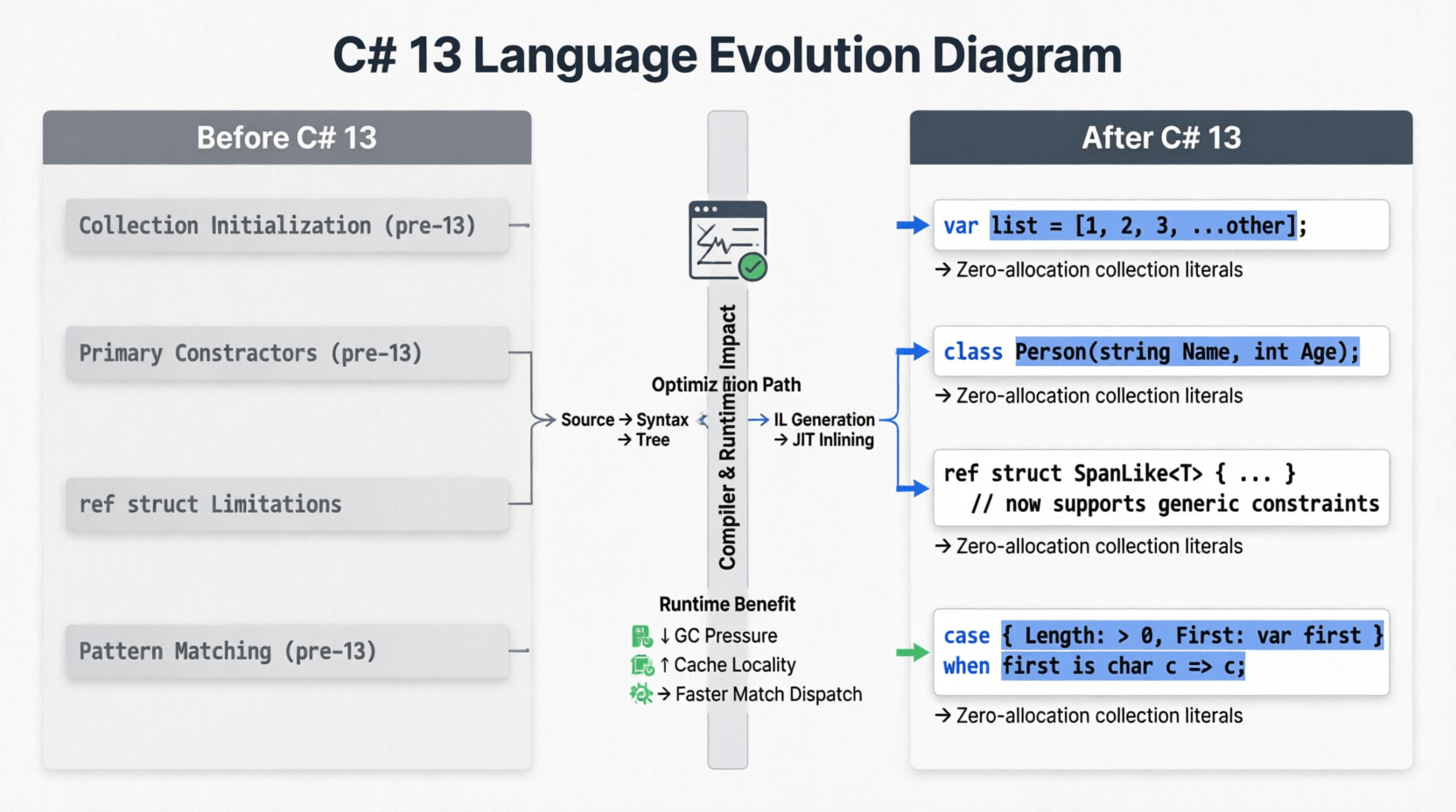 C# 13 introduces collection expressions, enhanced pattern matching, and primary constructor improvements that significantly reduce code verbosity. Combined with improved async/await performance, developers can write cleaner, faster code with less effort.