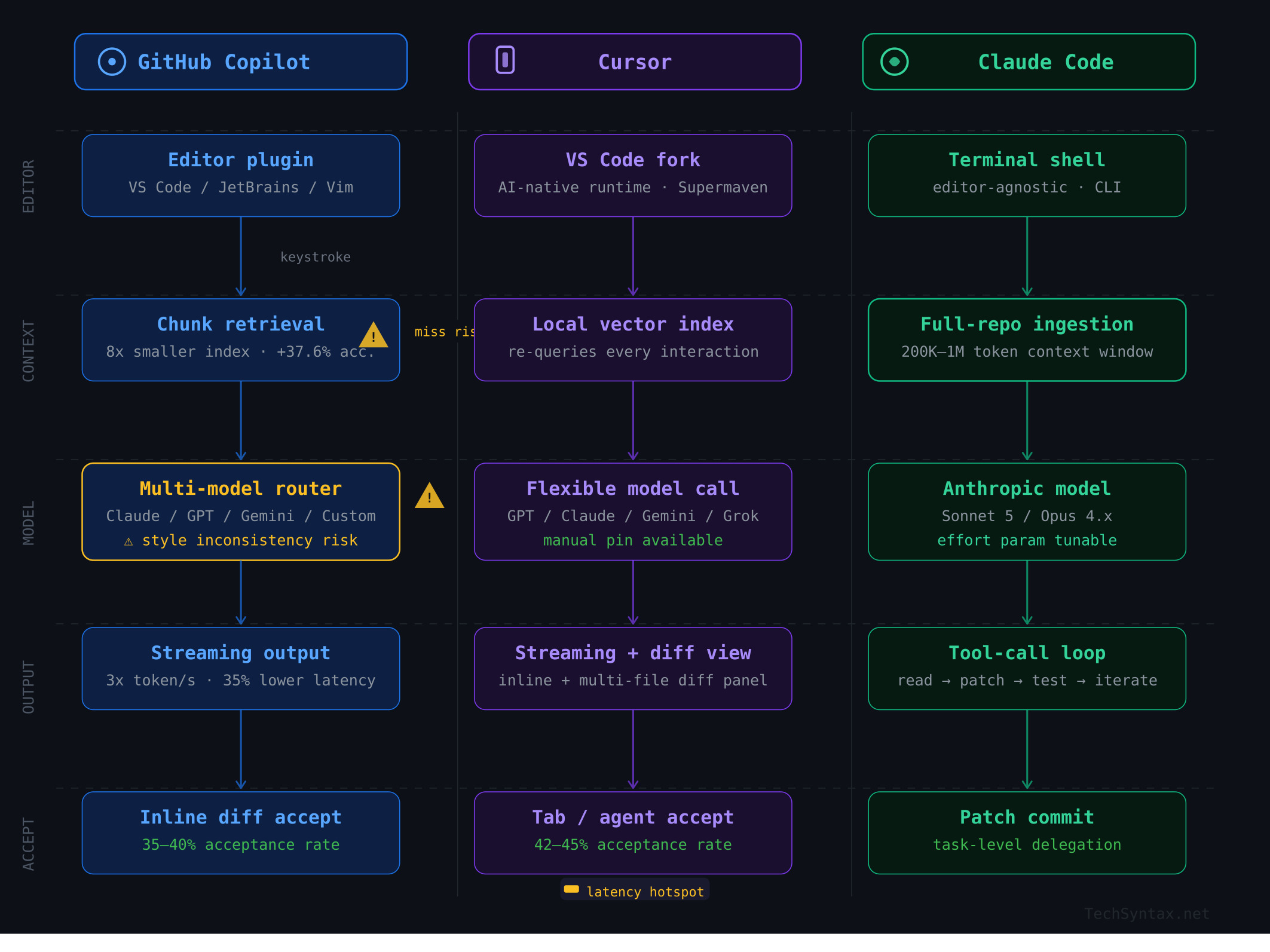 Copilot's completion pipeline: editor plugin → language server → GitHub's proxy → multi-model router → streaming response. The model router selects between Claude Opus 4.6, GPT-5.4, and Copilot's own custom completion model based on task type. Copilot Workspace runs a separate agentic loop: issue ingestion → plan generation → approval gate → multi-file patch → test run → PR creation.
