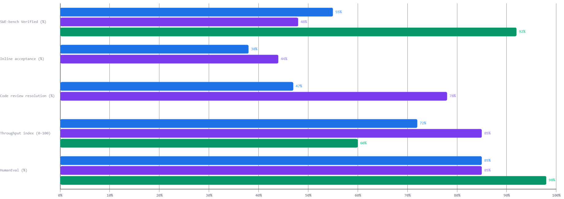 Key insight: SWE-bench Verified measures end-to-end real GitHub issue resolution — not toy completions. Claude Code's 80.9% result with Anthropic's Opus 4.5 harness reflects production-grade engineering capability. Cursor Copilot leads on inline acceptance. Copilot Workspace leads on GitHub-native issue-to-PR flows.