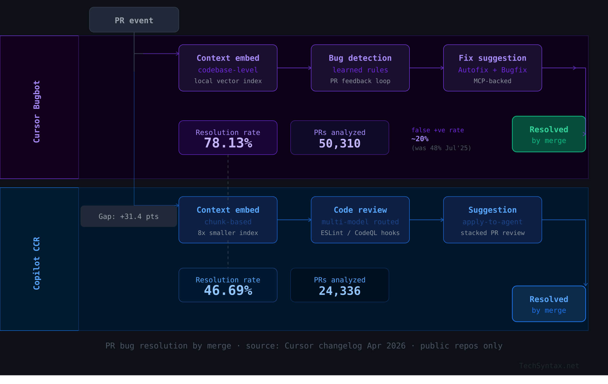 Across 50,310 analyzed public repository PRs, Cursor Bugbot resolved 78.13% of flagged issues by merge. GitHub Copilot CCR resolved 46.69% across 24,336 PRs. This is not a marginal gap — it reflects fundamentally different ML architectures. Bugbot uses self-improving learned rules that update from real PR feedback, closing the false-positive rate from 48% (July 2025 beta) to approximately 20% (April 2026).