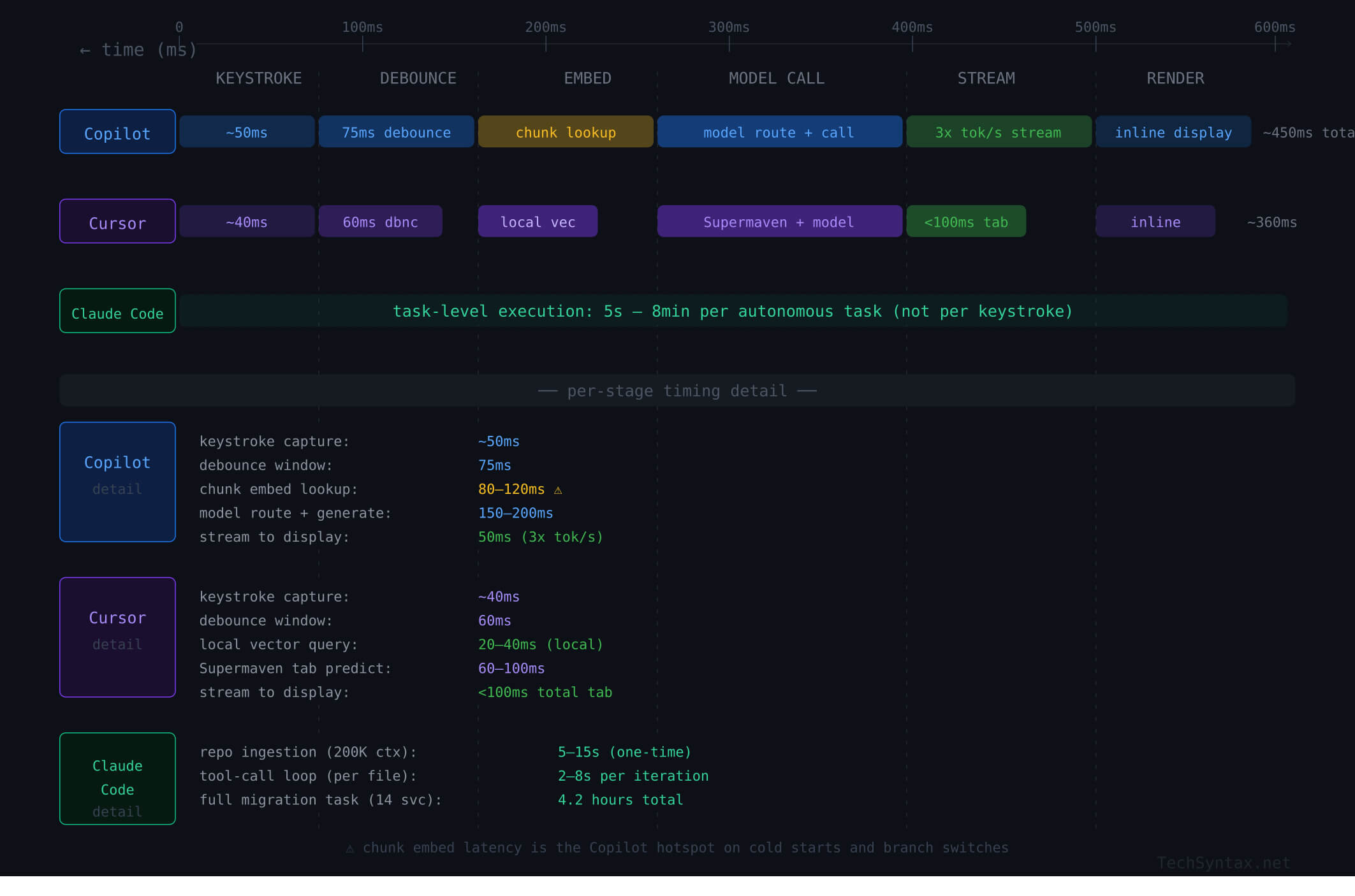 Claude Code is a task-level agent. Developers who use it for inline completion feel it is slow — because they are using the wrong tool for that mode. Its latency is measured in seconds per task, not milliseconds per keystroke.